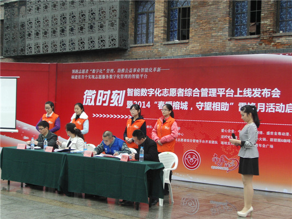 3月2日上午,共青团台江区委联合牵手阳光社会服务中心、微时刻研发团队在福州市台江青年会广场举办“微时刻”智能志愿者综合管理平台APP上线发布会暨2014年“春暖榕城,守望相助”雷锋月活动启动仪式。